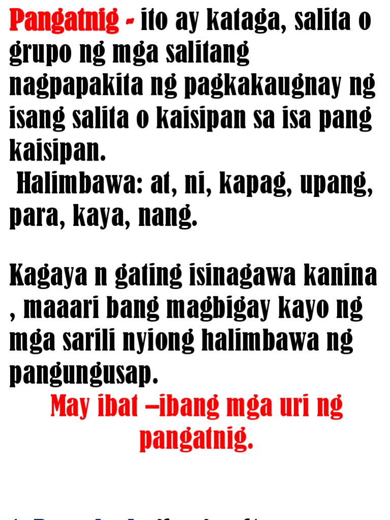 Ang nanay niya ay isang guro at ang kanyang tatay ay. Ang pangatnig ay ang mga salita o lipon ng mga salita at kataga na ginagamit sa pag-uugnay ng isang salita sa kapwa salita ng isang parirala sa kapwa parirala o ng isang pangungusap sa kapwa pangungusap. Mga Uri ng Pangatnig 1.