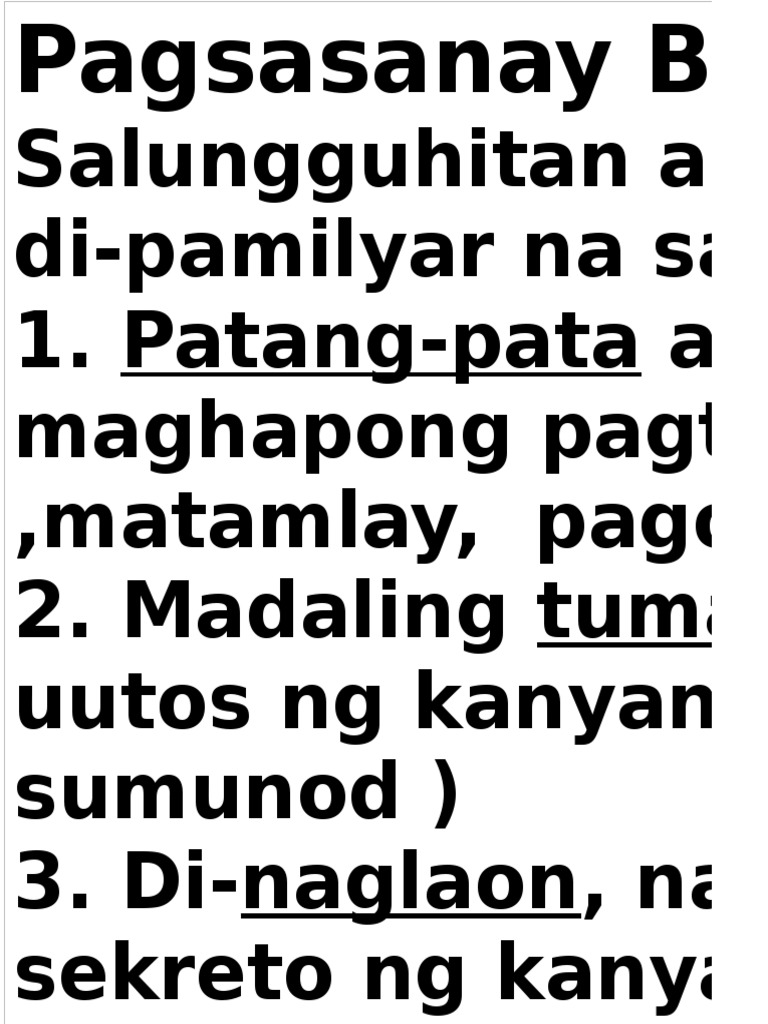 Sutla- makinismalambot at makinis. ALUMANA KahuluganPansinsalitang karaniwang ginagamit sa diwang pagtanggi at pinangungunahan ng hindi. Katoto Friend Kaibigan o matagal ng kasama maaring lalaki o babae.