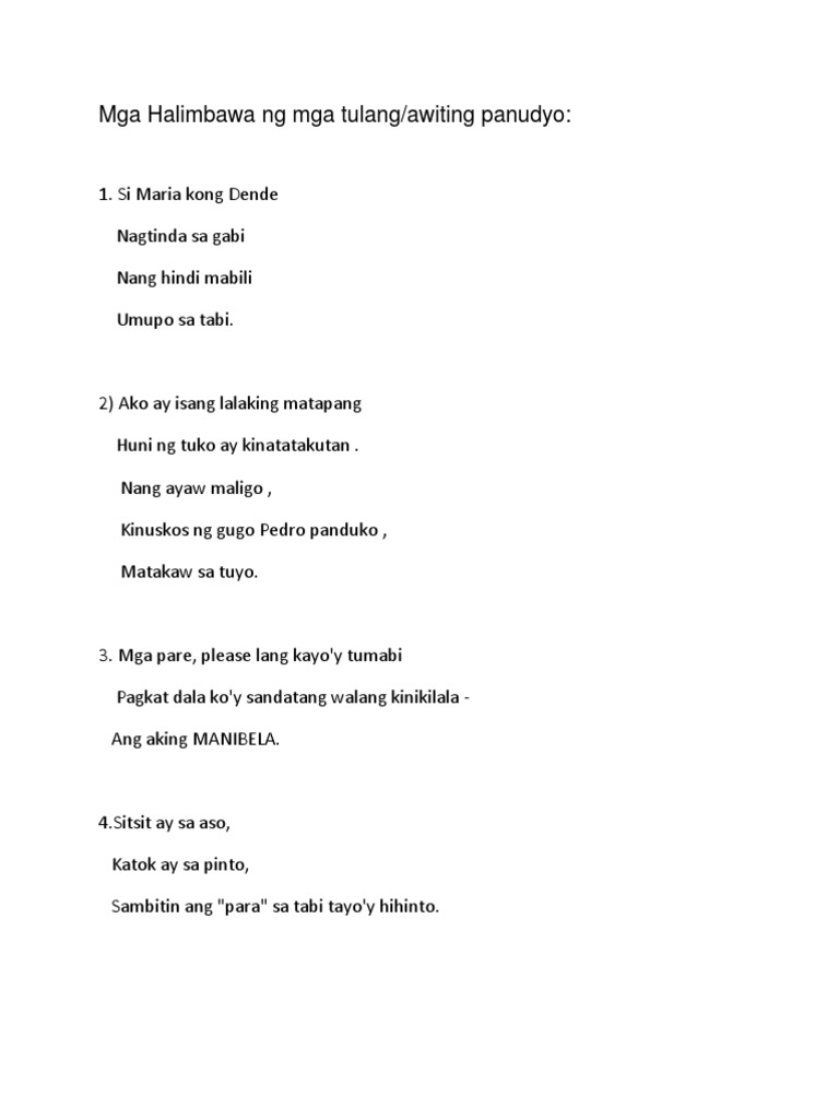 -si maria kong dende nagtitinda sa gabi nang hindi mabili umupo sa gabi. AWITING PANUDYO HALIMBAWA Sa paksang ito alamin natin ang mga iba pang mga halimbawa ng awiting panudyo. Contextual translation of 10 halimbawa ng tulang panudyo into English.