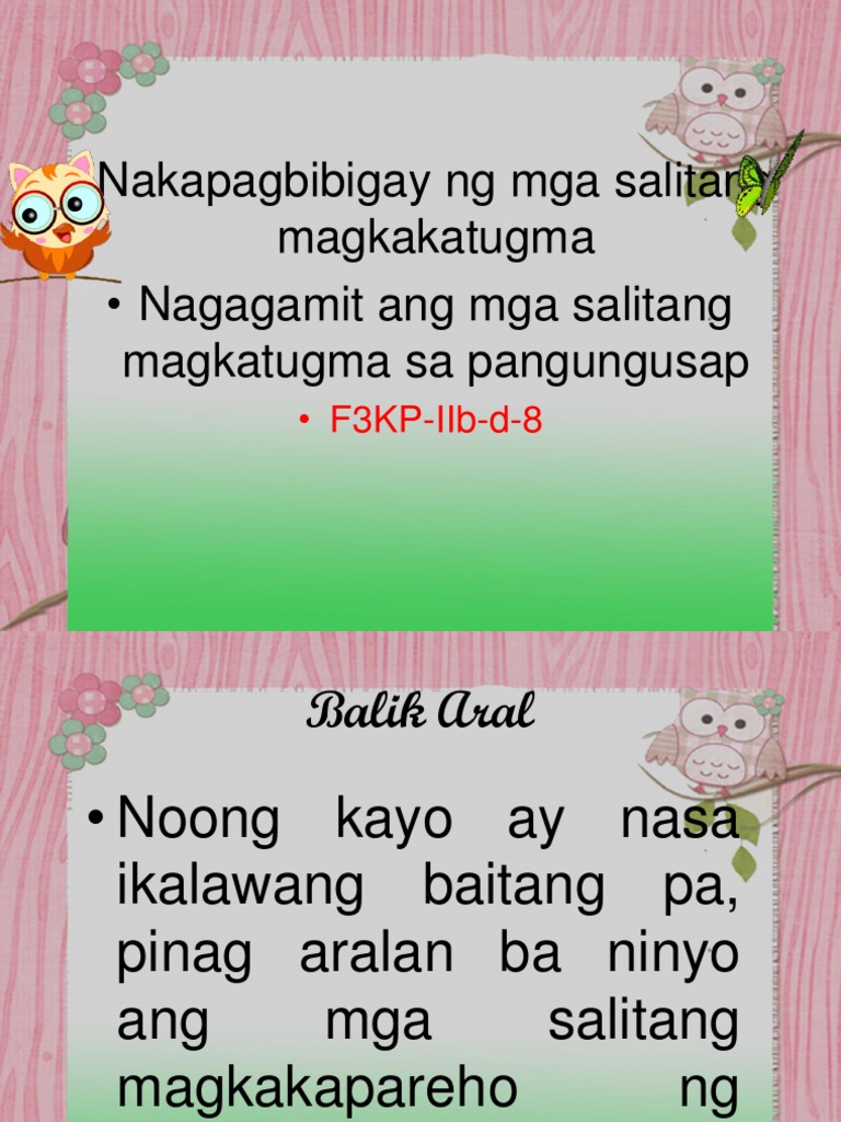 Documents Similar To salitang magkakatugma. Takdang Aralin Sumulat ng limang pares ng magkatugmang salita at gamitin ito sa pangungusap. Salitang Magkatugma At Mga Halimbawa Nito.