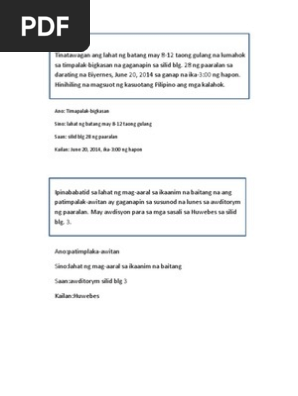Limang pamamaraan ng anunsyo. 1Bayabas at Balimbing 2Cake at Cookies 3Ibon at Manok 4Kalabaw at Baka 5Adobo at Sinigang Bibigyan lamang ng limang minute ang mga mag-aaral sa pagsagot. Ito ay nagbibogay batid kaalaman sa nais na ipagbigay impormsayo gamit ang mga impormatibong pamamaraan. Halimbawa ng anunsyo klasipikado Tagalog - Englisch API-Aufruf.