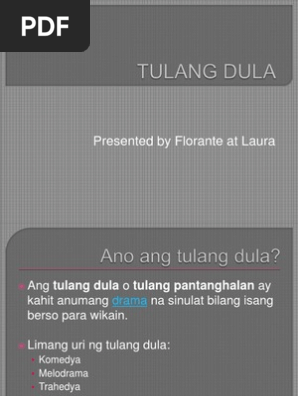 Ang tulang dula o tulang pantanghalan o dulang pantanghalan ay kahit anumang drama na sinulat bilang isang berso para wikainAt ang. Mga uri ng dulang pantanghalan ayon sa anyo 1. Oda ito ay isang papuri panaghoy o iba pang masiglang damdamin.