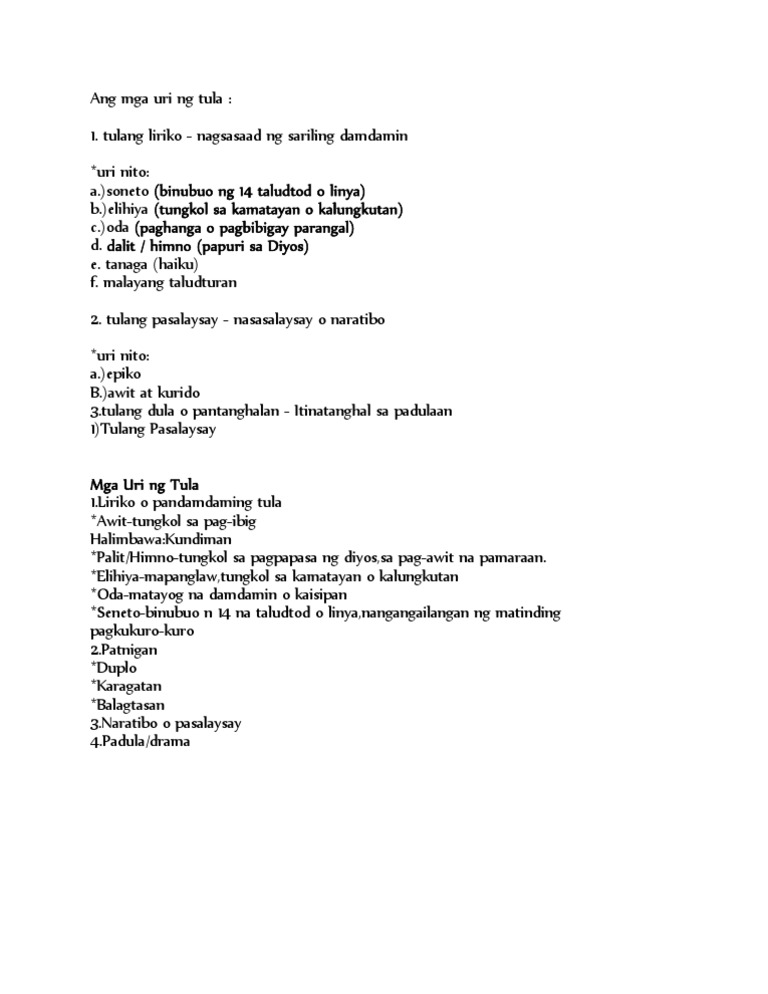 Tulang Liriko o Tulang Damdamin lyric poetry tulad ng isang soneto o ng isang oda na. Tulang Pantanghalan o Padula. Mayroon itong tatlong mga uri.
