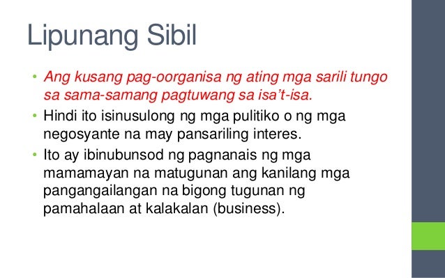 Pagkukusang-loobWalang pumilit nanakot o nanggipit sa mga kasapi nito upang makisangkot. Natutukoy ang mga halimbawa ng lipunang sibil at ang kani-kaniyang papel na ginagampanan ng mga ito tungo sa kabutihang panlahat. Ang lipunang sibil ay mga pankat grupo o mga miyembro ng mga pribadong mamamayan na siyang may malaking ambag sa mga desisyon sa isang pamayanan o lipunan.