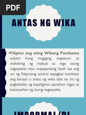 -pinalabas ng kalihim Jorge Bocoboang pagtuturo ng wikang pambansa ay sinimulan muna sa mataas at paaralang normal. Pabalbal Balbal May katumbas itong slang sa Ingles at itinuturing na pinakamababang antas ng wika. Ang kanilang prinsipiyo sa buhay ay hindi sila in o kabilang sa grupo kapag hindi sila marunong gumamit ng kanilang mga wika.