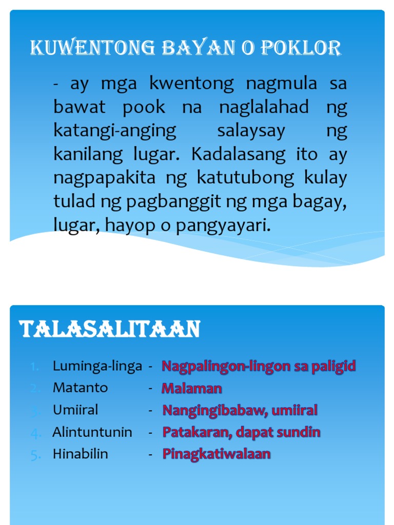 Ating tandaan na ang kultura natin ay naka-angat sa ating tradisyon. Ayon kina Semorlan et. Uri ng Maikling Kwento 24.