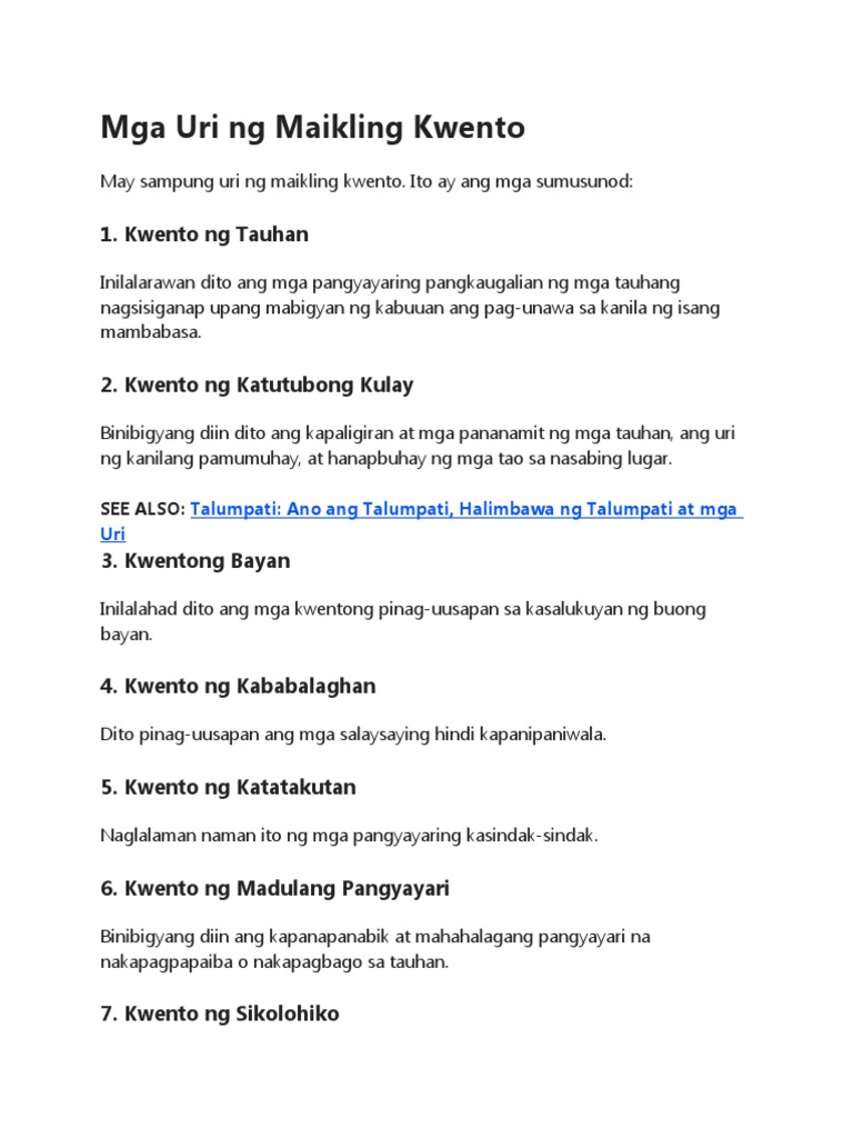 Kuwentong pakikisapalaran - Nasa balangkas ng pangyayari ang interes ng kuwento ng pakikipagsapalaran. To downloadprint click on pop-out icon or print icon to worksheet to print or download. Mga Halimbawa ng Mga uri ng Maikling Kwento Ipinasa niTheresa Lorque 7- ST MATTHEW Ipinasa kayJubilee Sayin -Kwento ng kababalaghan.