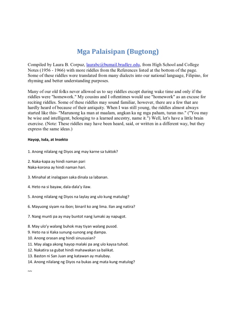 Mga Halimbawa Ng Palaisipan At Sagot Nito