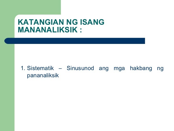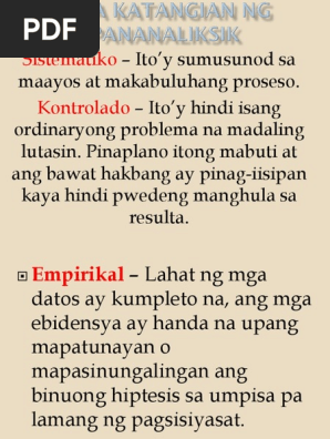 Kahulugan Katangian at Maka-Pilipinong Pananaliksik. Mula pa lamang sa mg a depinis yong inilahad na sa unang bahagi ng lik sy ong ito a y mahahango. Sistematiko Ito ay sumusunod sa lohikal na mga hakbang o proseso patungo sa pagpapatunay ng isang katanggap-tanggap na kongklusyon.