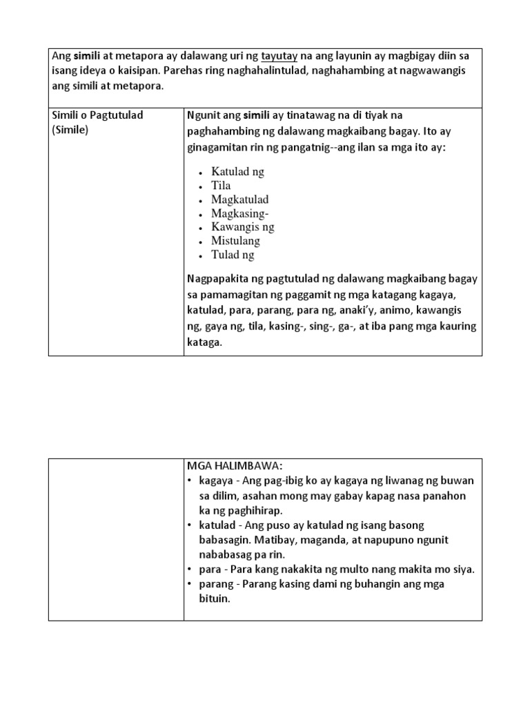 Ang aking mahal ay isang magandang rosas. Ang kanyang mga k amay ay yelong dumampi sa aking pisngi. Simili o Pagtutulad - di tiyak na paghahambing ng dalawang magkaibang bagay.